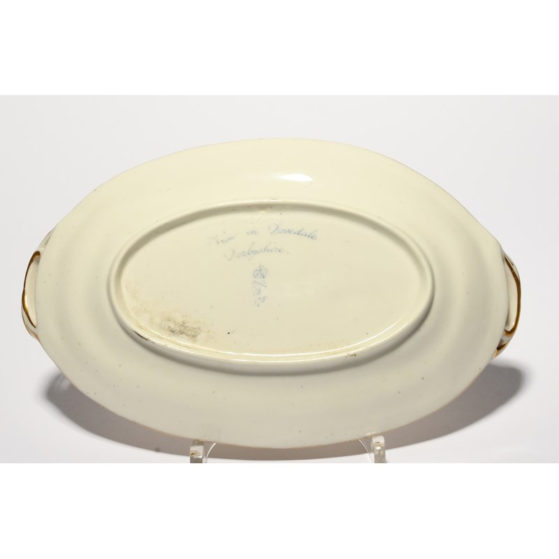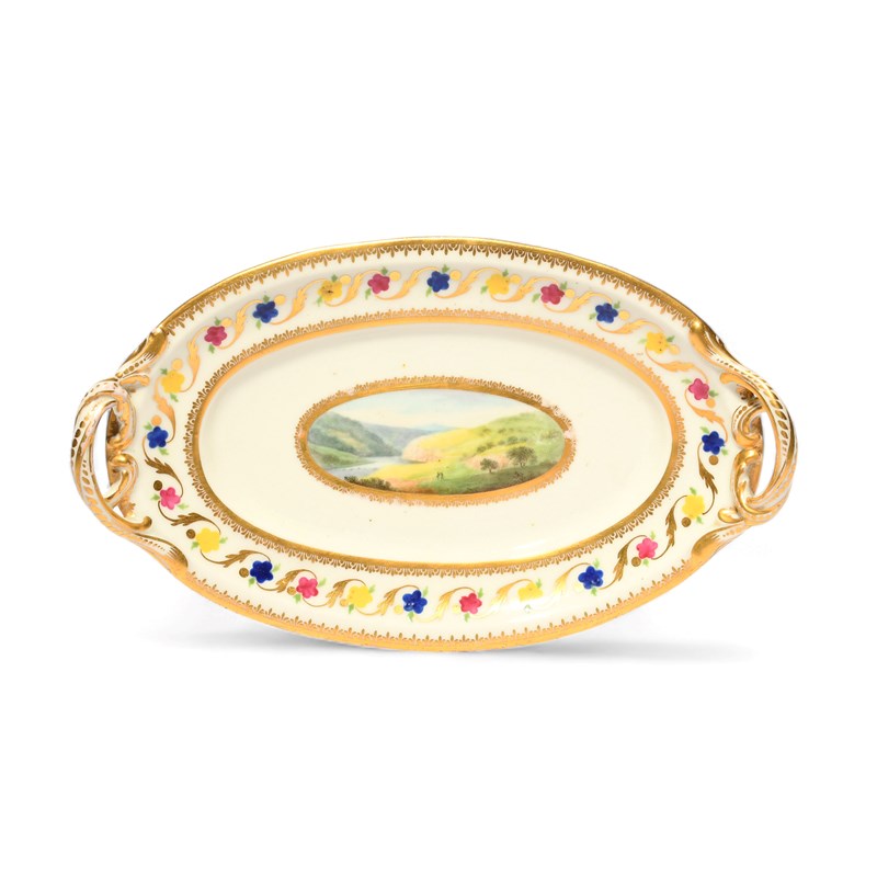 A Derby sauce tureen stand from the Blenheim Service, c.1790-1800, painted possibly by George Robertson with a landscape view of Dovedale in Derbyshire, within a colourful border of red, yellow and blue flowerheads linked with gilt foliage, titled and marked in blue to the underside, pattern number 178, 23cm.