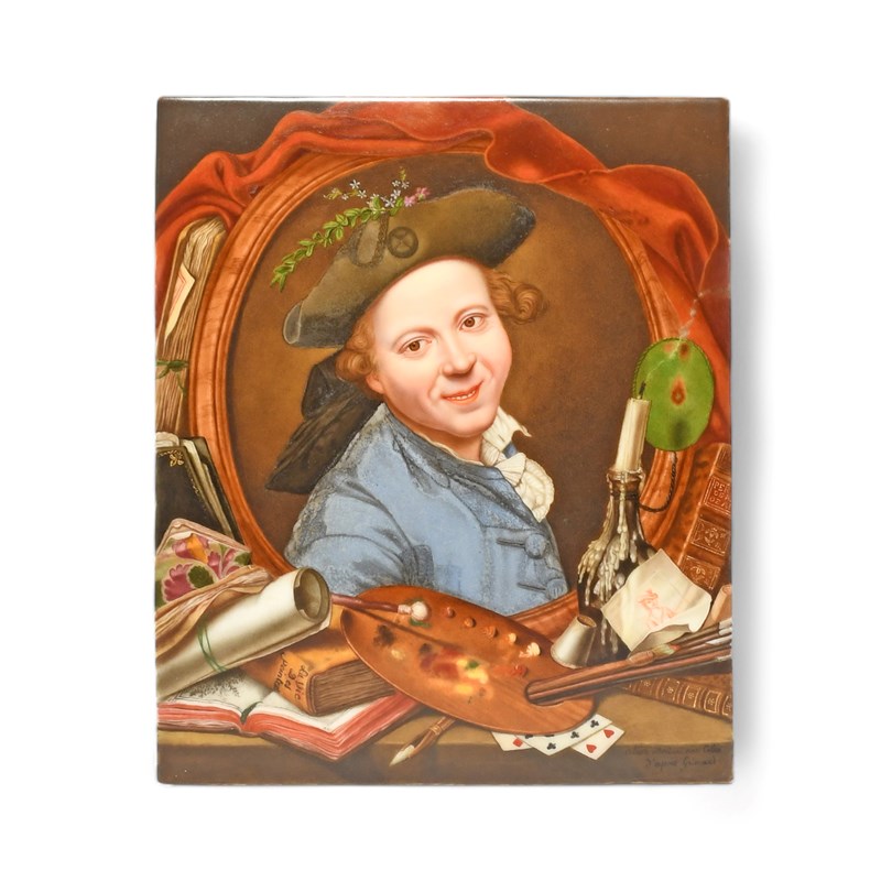 A Paris porcelain rectangular plaque, 19th century, painted by Celeste Breton (née Colen) with the portrait of a smiling man within a wooden frame, surrounded by an artist's accoutrements, various books and playing cards, signed bottom right 'Celeste Breton née Colen d'apres Grimaud', signed again to the reverse stating that Breton was a pupil of Madame Jaquotot, 24.1cm x 19.6cm.