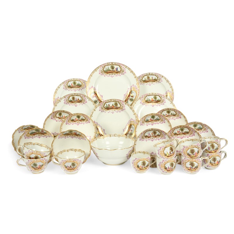 A composite Meissen-style tea service, probably 19th century, decorated with panels of figures beneath trees and before buildings, within elaborate laub und bandelwerk borders in puce and gilt, varying blue crossed swords marks, some cancelled. Comprising: an ogee slop bowl, three ogee cups and three saucers, seven coffee cups, seven saucers, one large plate and five smaller plates. (27)