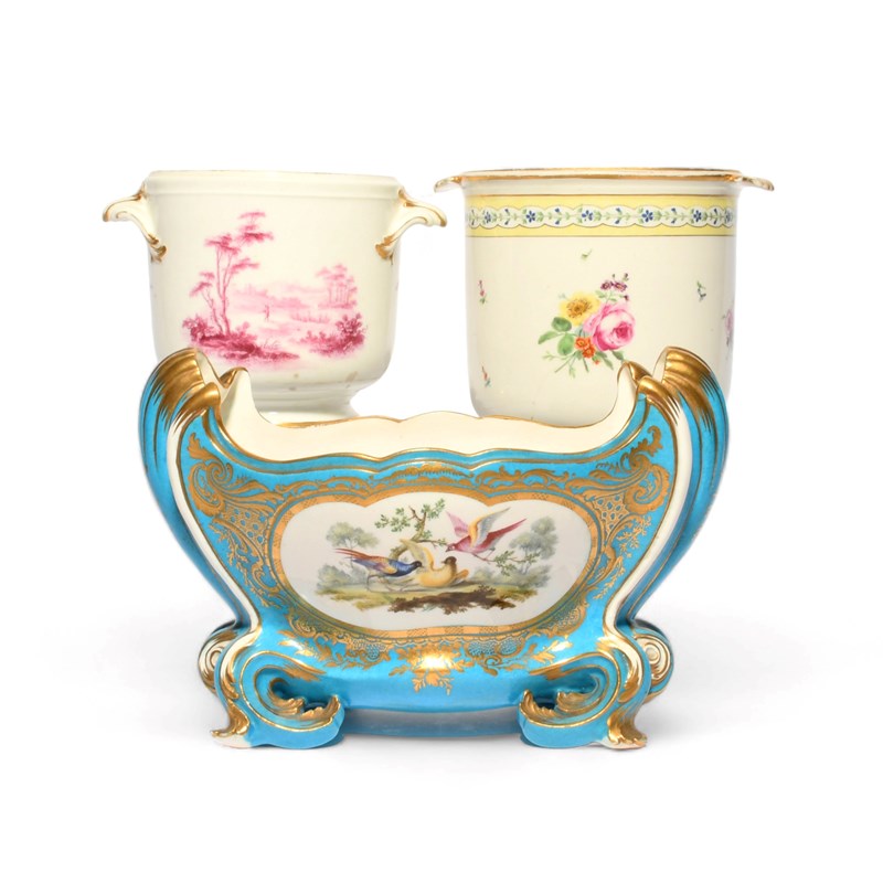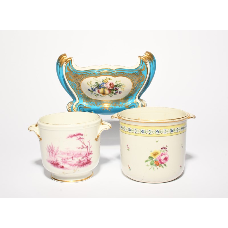 Two Continental porcelain coolers (seaux), 18th/early 19th century, one Vienna and painted with flower sprays, the other Sèvres and painted in puce monochrome with European landscape scenes, together with a Sèvres-style jardinière, painted with panels of birds and fruit within elaborate gilt borders on a turquoise ground, damages, 24cm across max. (3)