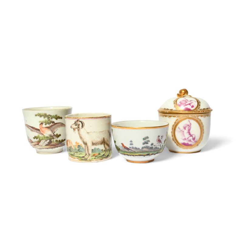 A small sucrier and cover, c.1770, possibly Brussels, painted in purple camaieu with scenes of putti and panels of Classical motifs, the cover with a fruit finial, together with a Zurich cup painted with a bird, a Nymphenburg coffee can painted with a goat, and a Nove tea cup painted with birds in a landscape, some damages, 9.4cm max. (5)