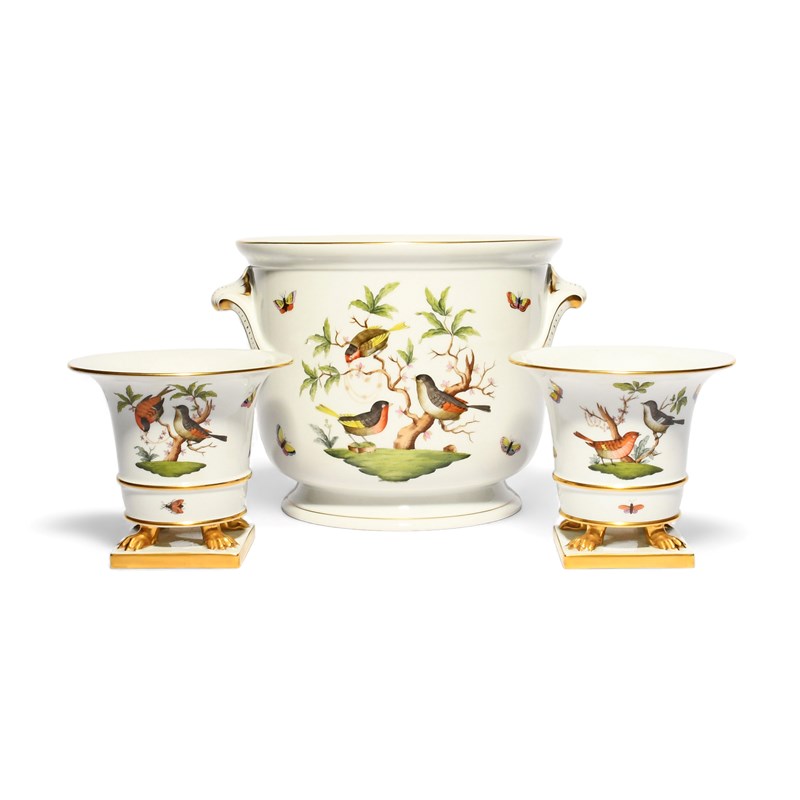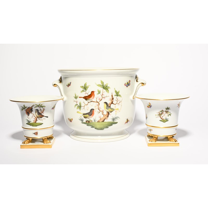A large Herend bottle cooler, modern, painted with the Rothschild Birds pattern, with European songbirds perched on branches draped with jewels, and a pair of small flared vases in the same pattern, raised on claw feet above square bases, blue printed marks, 20.5cm max. (3)