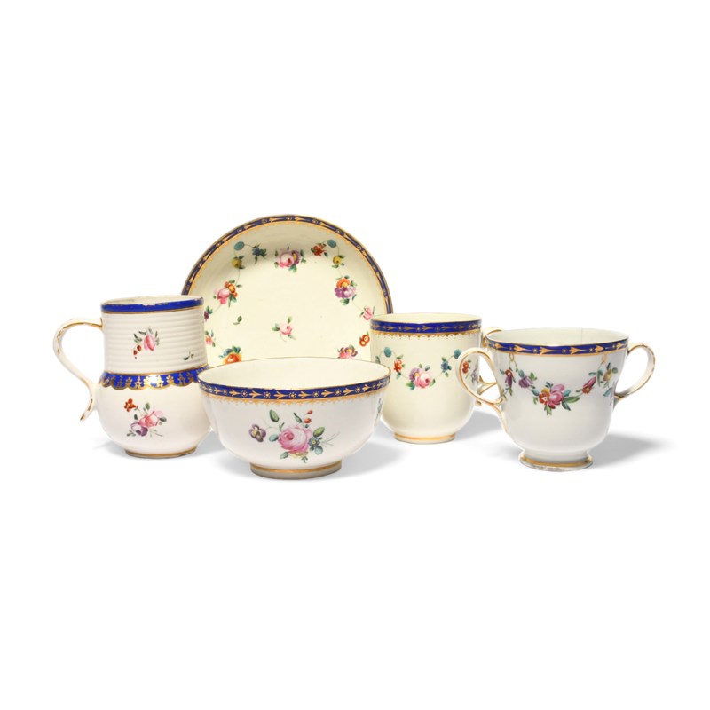 A group of Chelsea-Derby teawares, c.1780, including a thistle-shaped mug, a two-handled cup, a breakfast coffee cup and saucer and a small bowl, all painted with sprays or garlands of flowers, the rims with narrow bands of gilt designs on a blue ground, gilt anchor and D marks or blue crowned D marks, 15.7cm max. (5)