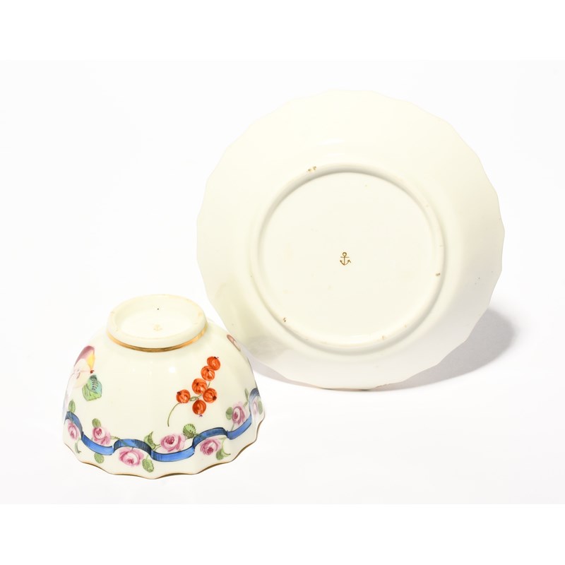 A Chelsea-Derby fluted teabowl and saucer, c.1770-75, well painted with sprigs of fruit including a cut pear, cherries, redcurrants and blackberries, within a continuous border of pink roses entwined with a blue ribbon, gold anchor marks, 12.2cm. (2)