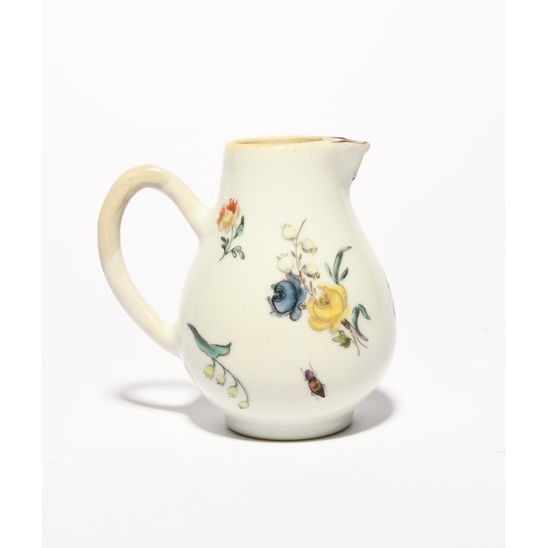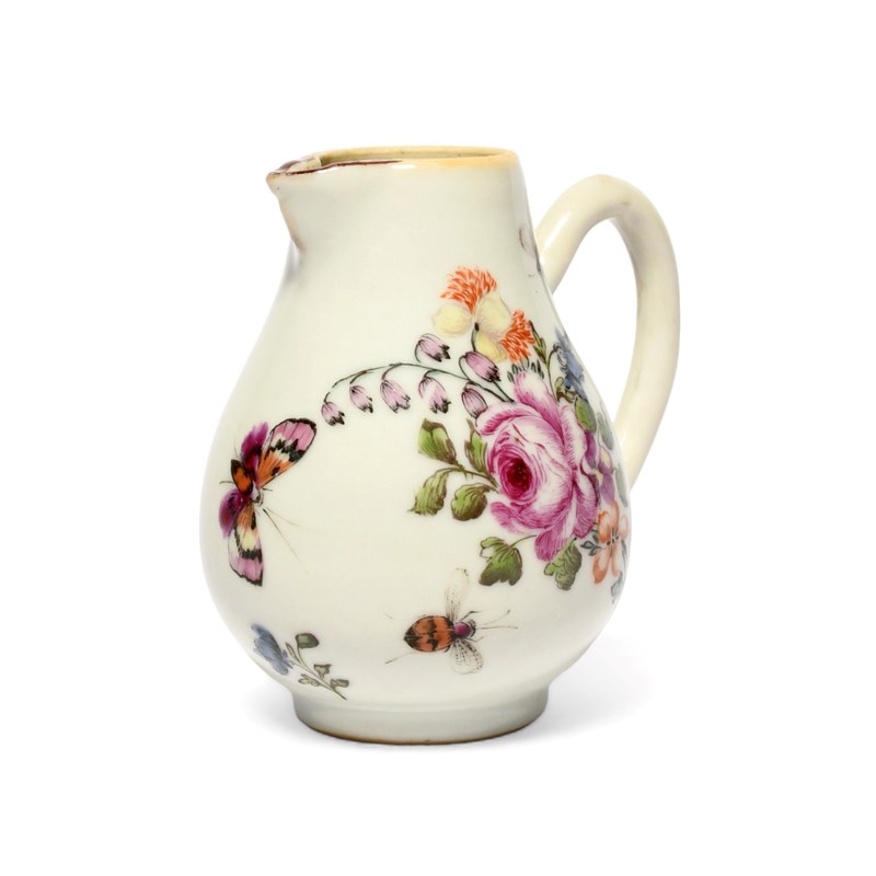A Chinese porcelain London-decorated milk jug, c.1750, the decoration a little later, finely painted in the atelier of James Giles with a butterfly and two bees in flight around a flower spray including a pink rose, the cover lacking, some retouching to the handle, 9.3cm.