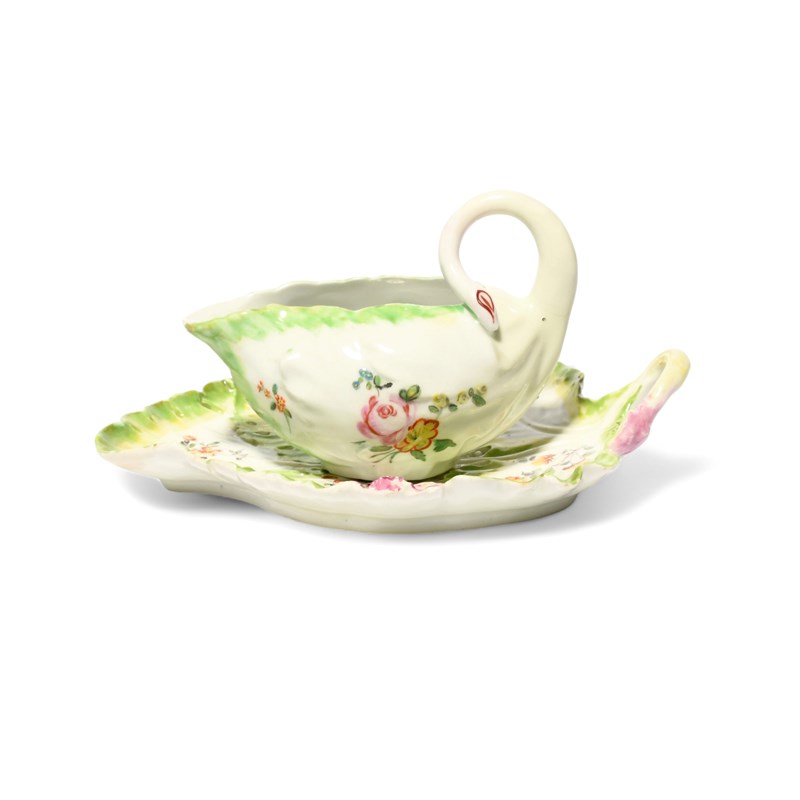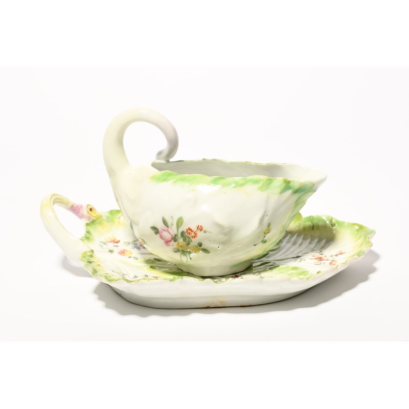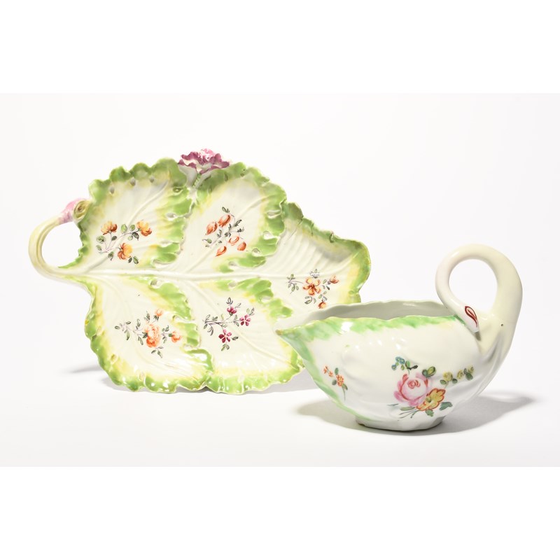 A Derby creamboat and stand, c.1760, moulded of overlapping leaves edged in green and painted with flower sprays, the creamer's handle restored, 16.5cm. (2)