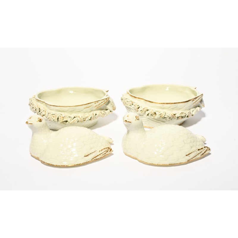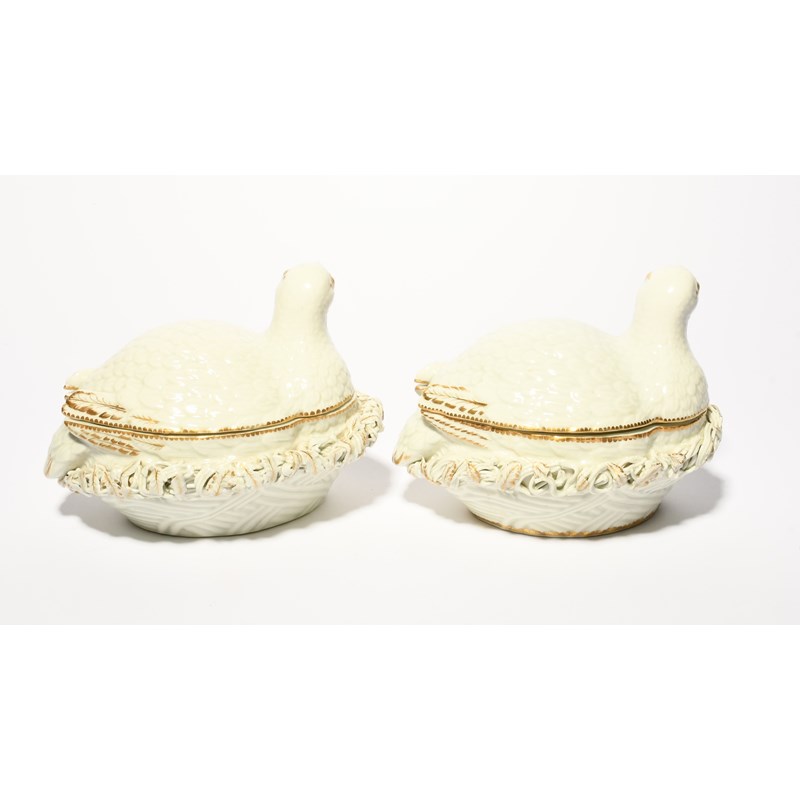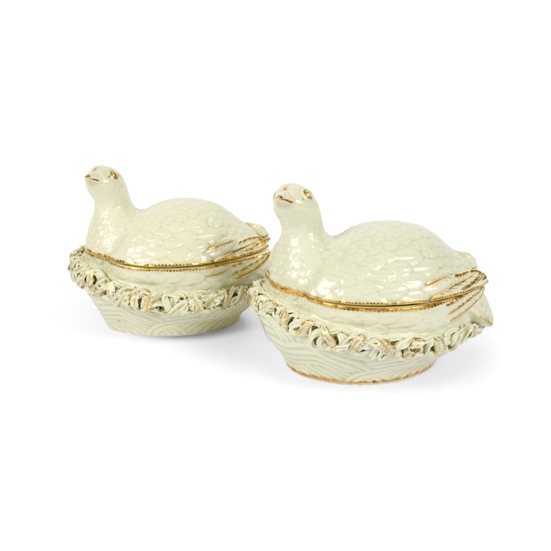 Two rare Worcester quail tureens and covers, c.1760, naturalistically modelled with heads slightly turned, seated in nests of coiled leaves set into basket bases, left in the white with gilt detailing, 19cm. (4)