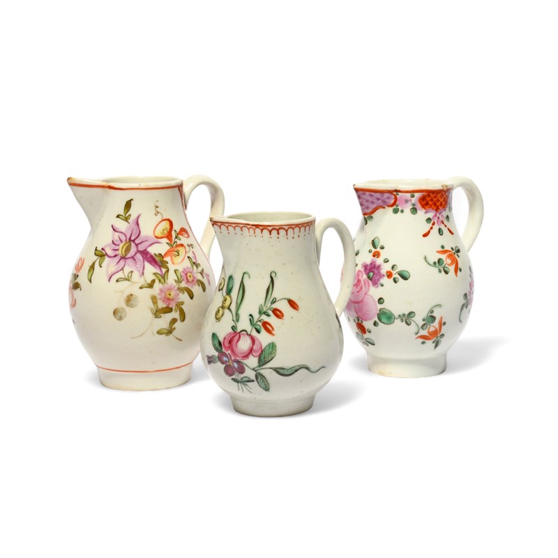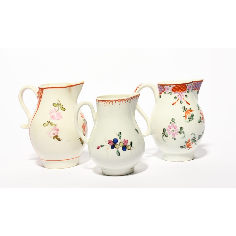 Three English porcelain milk jugs, c.1770-90, two Lowestoft and painted with flowers and trellis panels, one Philip Christian (Liverpool) and painted with flower sprays, small faults, 8.5cm max. (3)