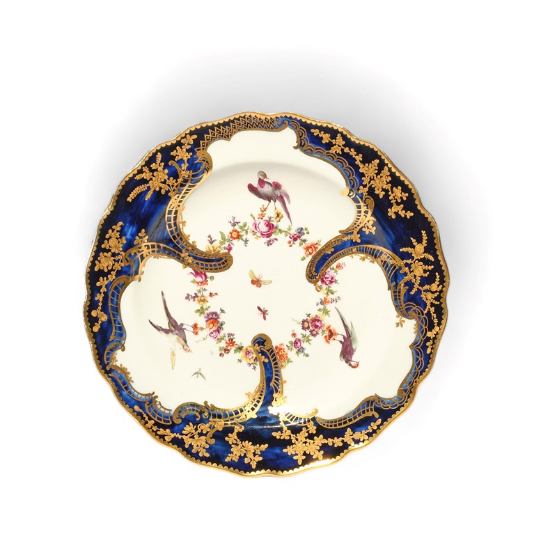 A Chelsea cabinet plate, c.1760-65, the well painted with three birds perched on a continuous flower garland, the rim with a shaped mazarine blue border with gilt flowers and trellis work, gold anchor mark, 21.7cm.