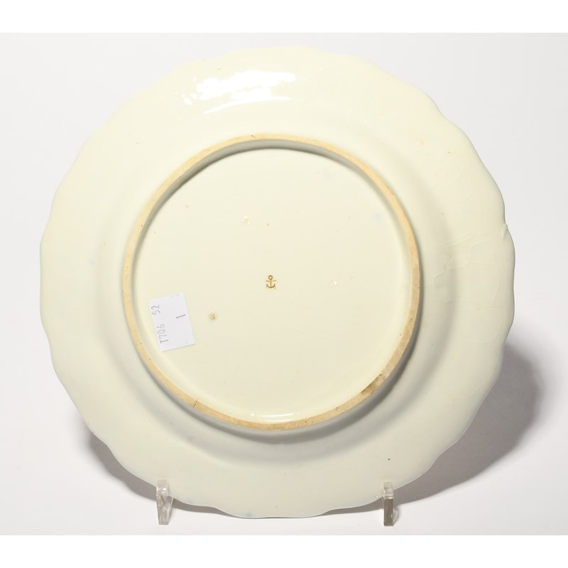 A Chelsea cabinet plate, c.1760-65, the well painted with three birds perched on a continuous flower