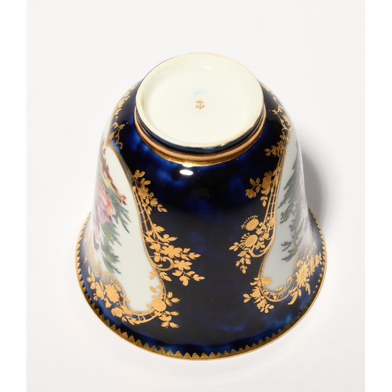 A Chelsea cabinet beaker, c.1760-65, painted with two panels of courting couples in woodland settings, reserved within gilt floral and trellis work borders on a mazarine blue ground, gold anchor mark, 9cm.