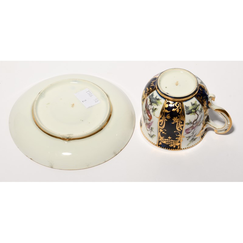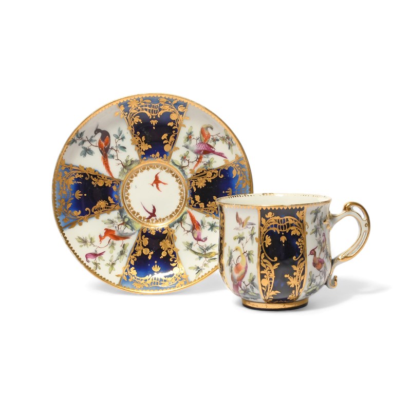 A Chelsea cabinet cup and saucer, c.1760-65, finely decorated with panels of colourful birds perched in branches, alternating with mazarine blue panels with gilt trellis and foliage, gold anchor marks, 12.3cm. (2)