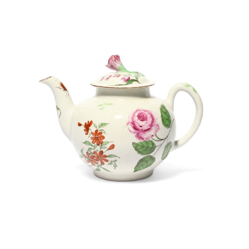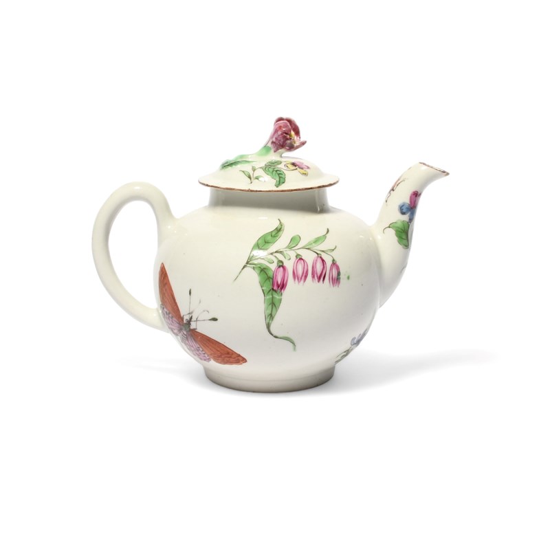 A small Scratch Cross Worcester teapot and cover, c.1754, finely painted with a pink rose spray and other flowers beside a large butterfly, the spout with a ladybird and a spray of heartsease, the flat cover with a floral finial, incised cross to the base, 14cm across. (2)