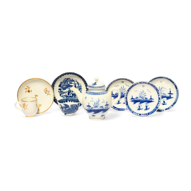 A small collection of Caughley miniature teawares, c.1770-80, including a teapot and cover and three saucers painted in underglaze blue with the Island pattern, a miniature teabowl and saucer printed with the Fisherman and Cormorant pattern, and a coffee cup and saucer decorated with gilt flower sprigs, some restoration and damages to the Island pieces, 9.3cm max. (9)