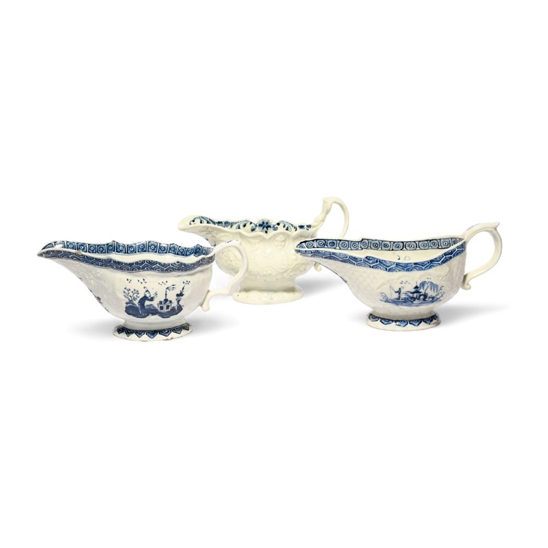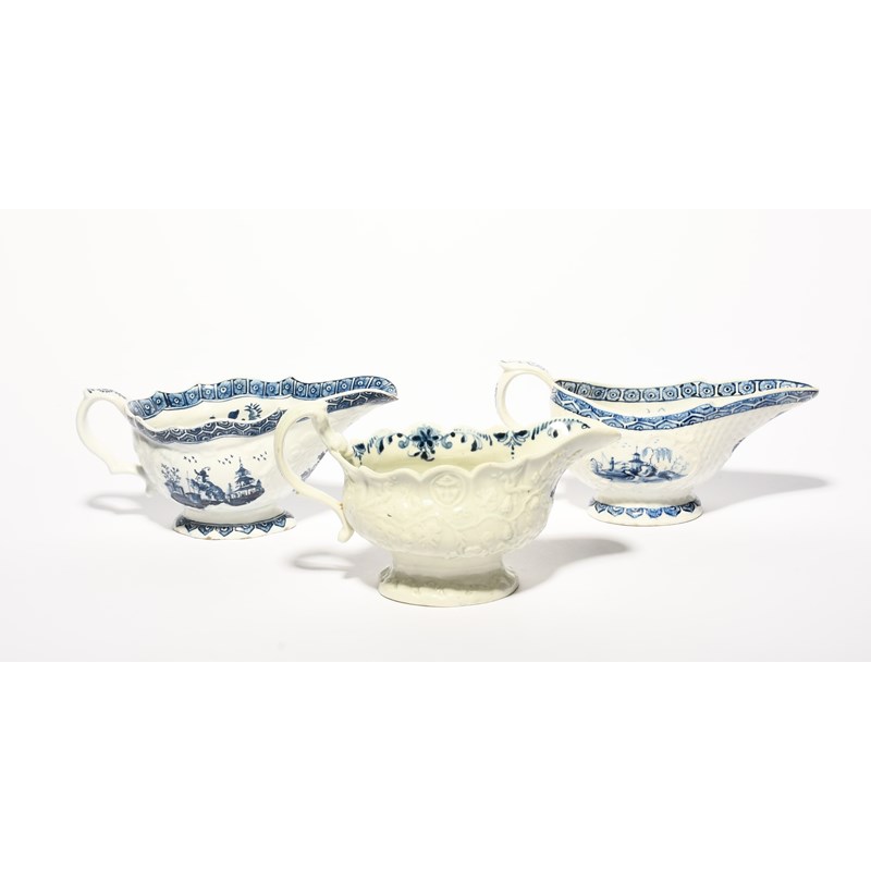 Three English porcelain blue and white sauceboats, c.1770-80, one Seth Pennington (Liverpool) and moulded with Liver birds perched on grapevine, another Derby and painted with Chinoiserie scenes on a pineapple-moulded ground, the last Bow and decorated with exaggerated Oriental figures within moulded panels, with a cell diaper border, 20.2cm max. (3)