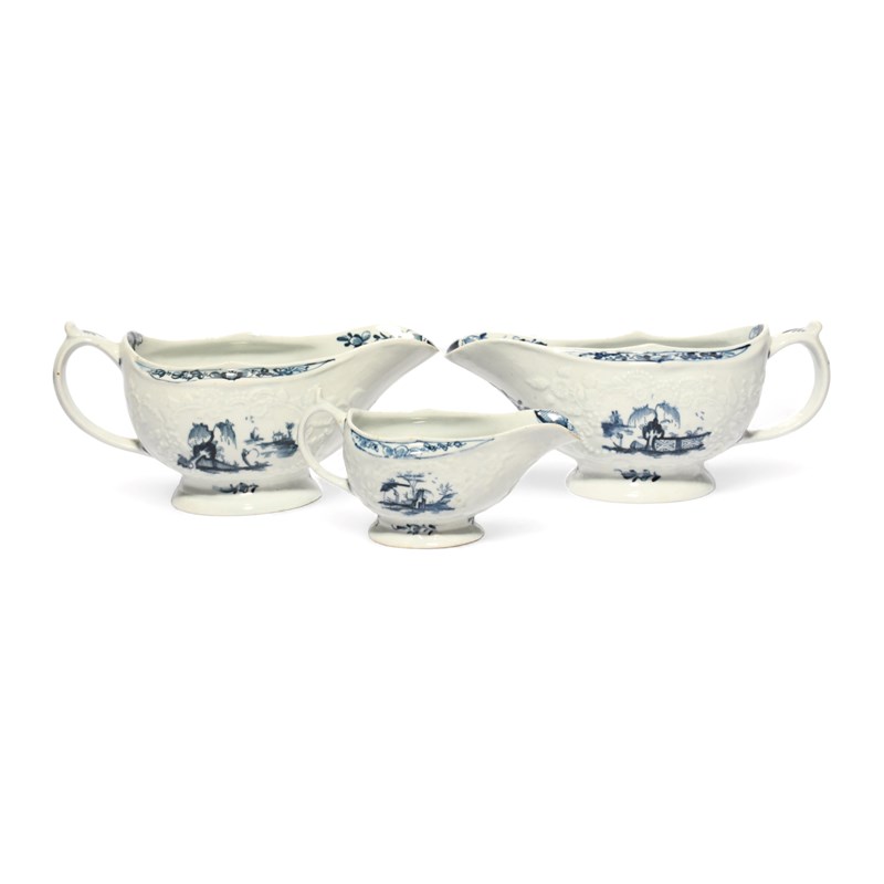 A pair of large Lowestoft blue and white sauceboats, c.1765-70, of Hughes type, moulded with floral panels, painted with vignettes of Chinese figures in boats and fishing off a small island, the interiors with peony sprays, and a creamboat with similar moulding and decoration, painter's numerals, a long crack to one sauceboat, 21cm max. (3)