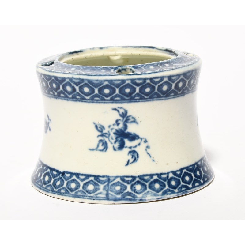 A rare Caughley blue and white inkwell, c.1780, of capstan shape, printed with small flower sprigs between cell diaper borders, the shoulder pierced with four quill holes, blue C mark, the liner lacking, 8.2cm across.