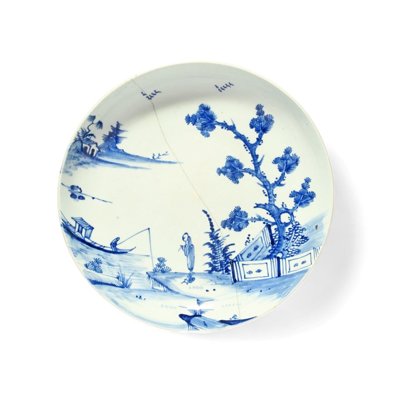 A rare Vauxhall blue and white saucer dish, c.1755, painted with a Chinese figure standing beneath a tall pine tree on a promontory, a figure fishing from a sampan beside, broken and restuck, 19.6cm.