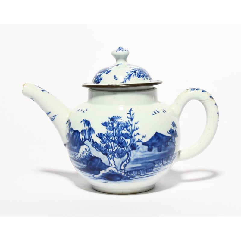 A small and rare Vauxhall blue and white teapot and cover, c.1756-58, the globular body painted with a small hut and trees in an island landscape, some damages, the cover with a metal repair to the rim, 13.5cm across. (2)