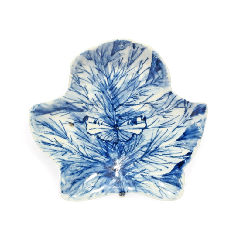A Vauxhall blue and white pickle dish, c.1755-58, of leaf shape, painted with a moth amidst heavy leaf veining, the veining moulded to the underside, a repair to the stalk, 10.3cm.