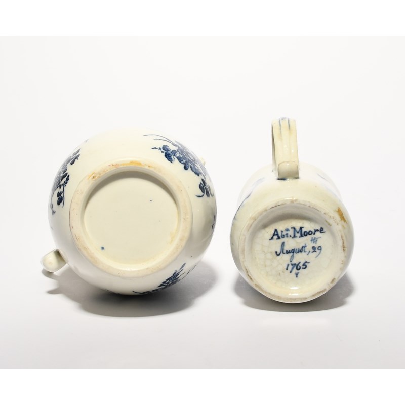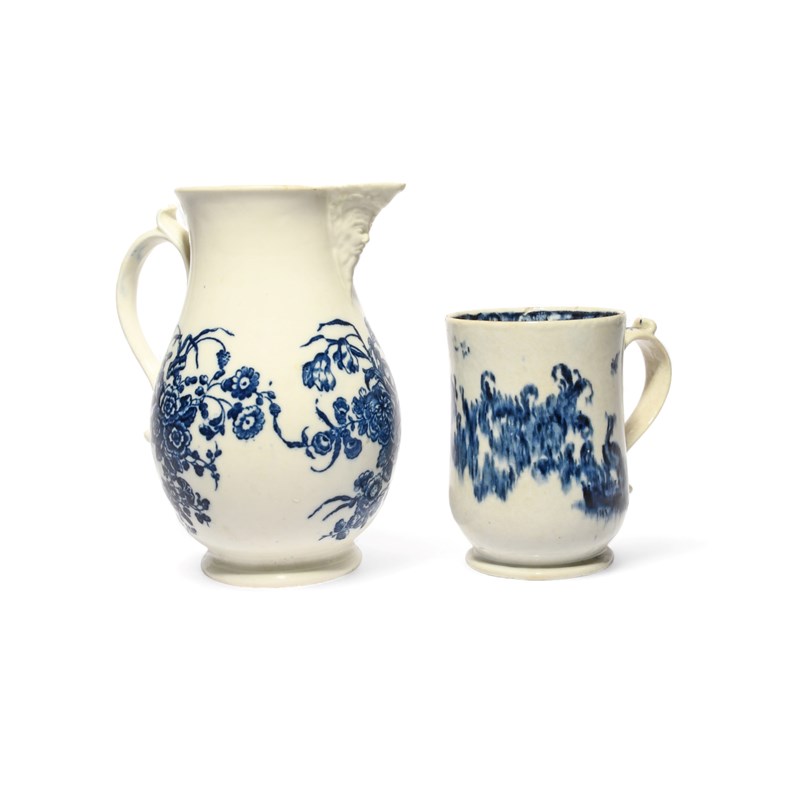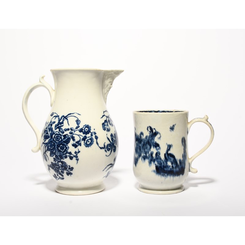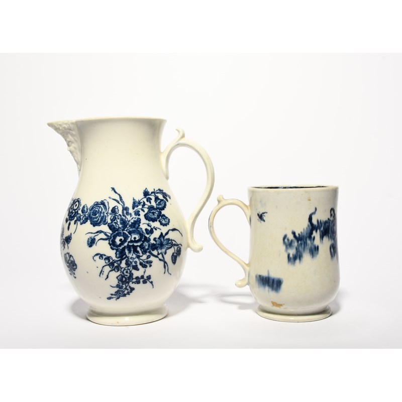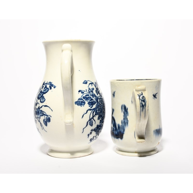 A Caughley blue and white mask jug, c.1770, printed with the Three Flowers pattern, and a Lowestoft-style mug, decorated with a bird amongst foliage, the base inscribed 'Abm Moore August 29th 1765', 18.2cm max. (2)