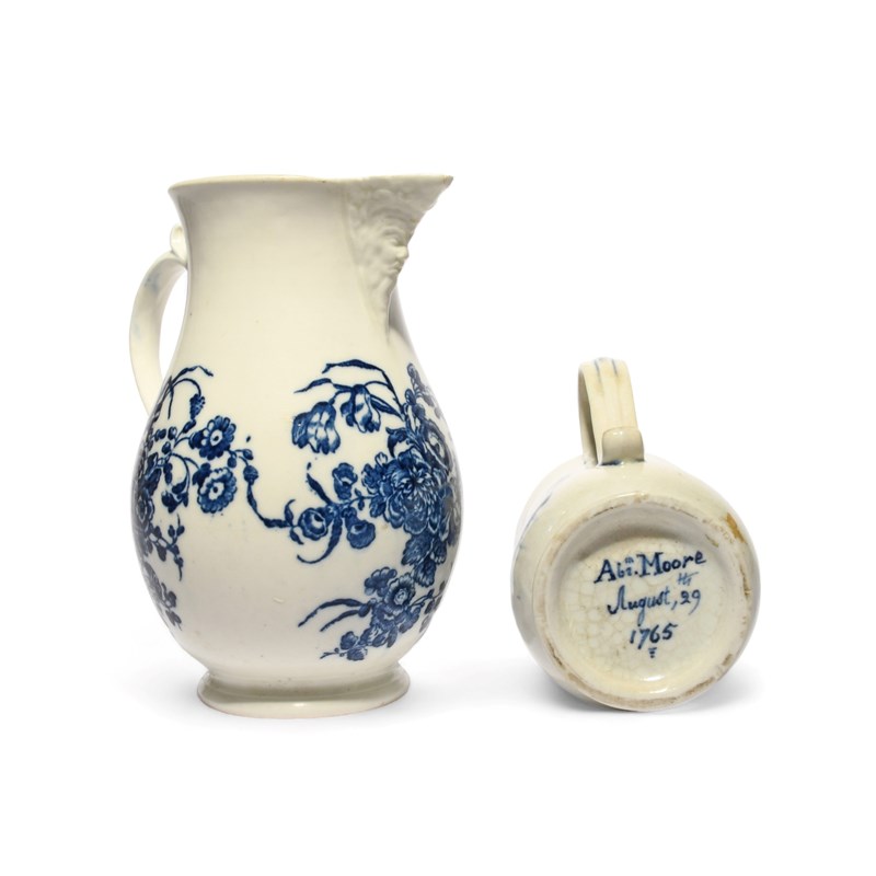 Cf. British Museum, Accession No. 1887,0307,XI.7 for a genuine example, and 1957,0403.1 for a modern forgery. The genuine Lowestoft mugs were made in varying sizes, although it is not known who Abraham Moore was.