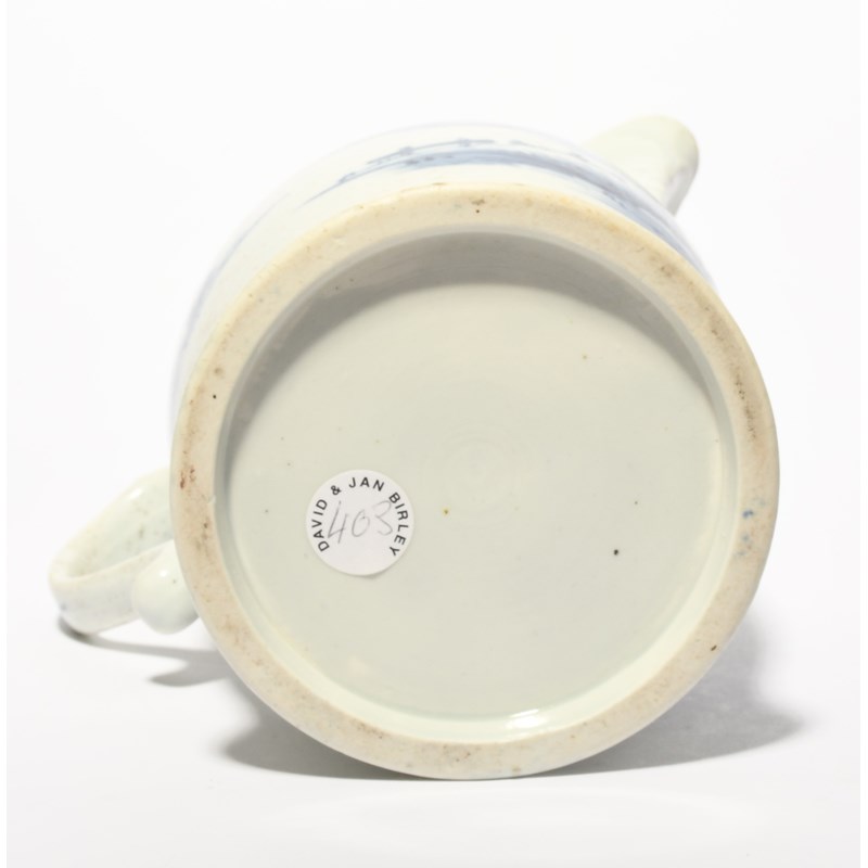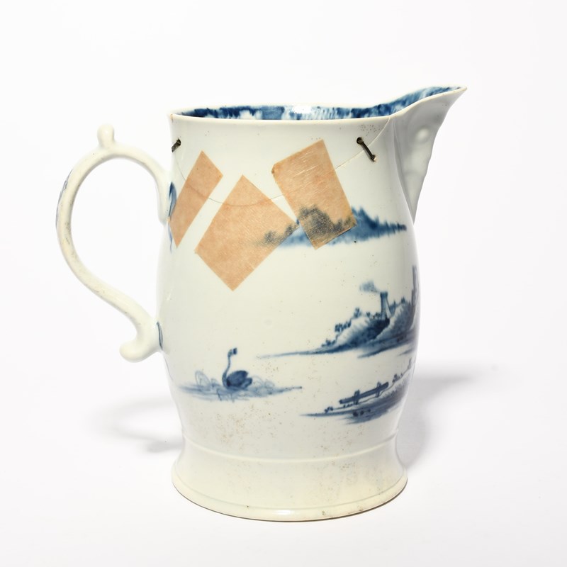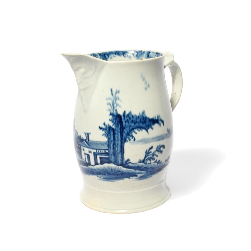 A William Reid blue and white jug, c.1756-58, the barrel shape painted with low buildings and a smoking kiln chimney in an island landscape, a sailing boat to one side, the interior rim with a formal design, the spout with rare scrolled moulding, a rim section broken out and repaired, 17.7cm.
