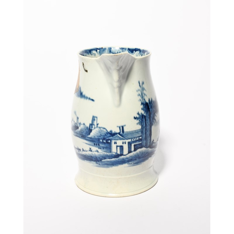 A William Reid blue and white jug, c.1756-58, the barrel shape painted with low buildings and a