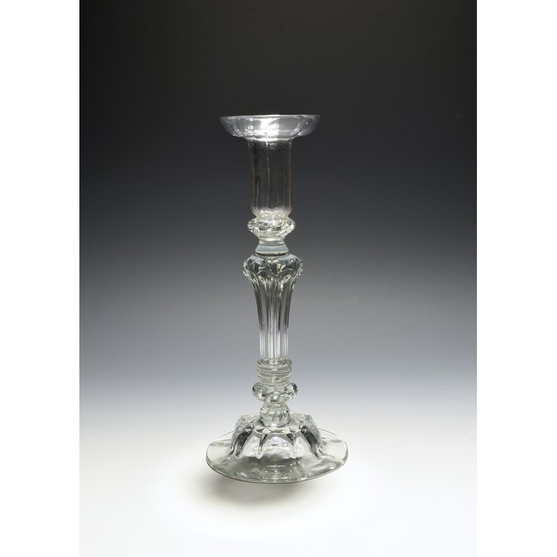 A tall pedestal glass candlestick, c.1720, the moulded sconce with everted rim, raised on a pedestal