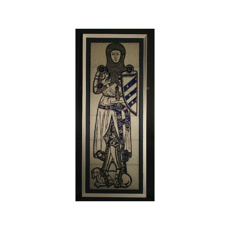 A Poole Pottery tile panel by Tony Morris, painted with 'Sir William Fitzralph', framed paper authentification to reverse 101cm. high