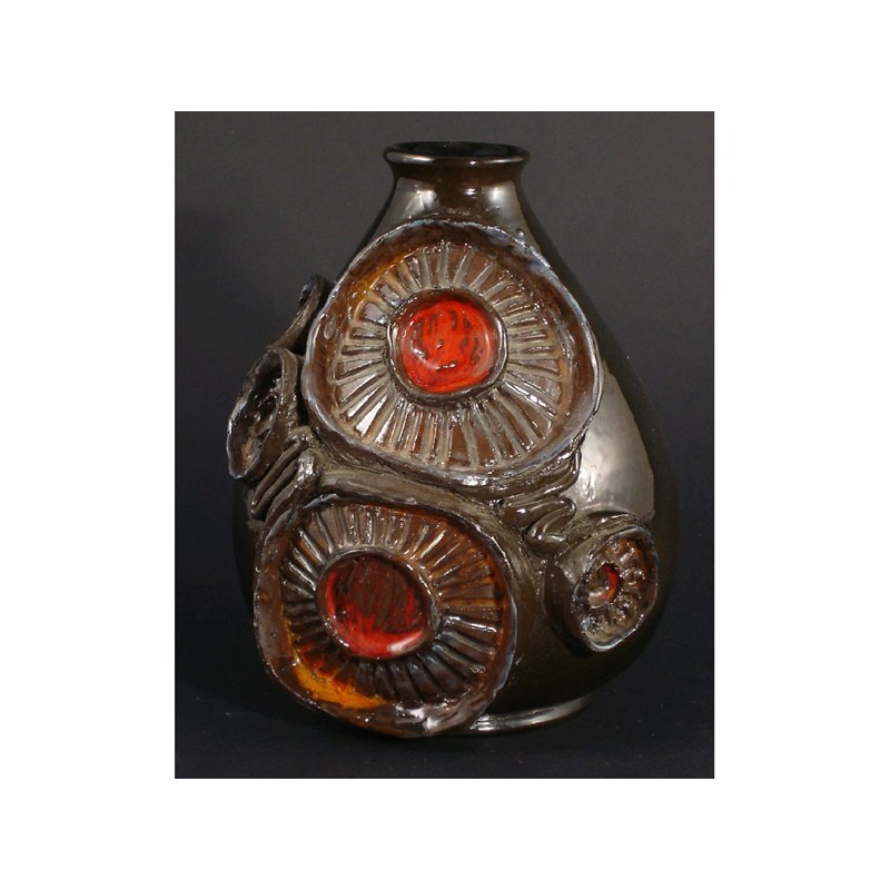 A Poole Pottery Studio Craft vase probably by Tony Morris, crudely applied with sucker roundels, with glazed red medallions, on a thick brown ground impressed mark 20cm. high
