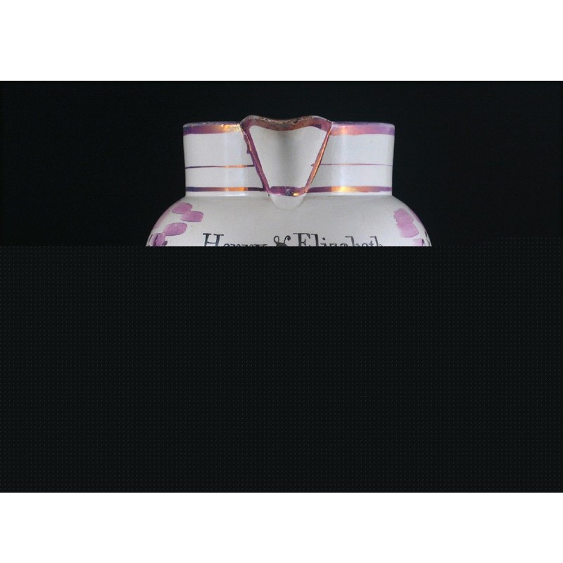 A dated pink lustreware jug, inscribed 'Henry & Elizabeth Brough, Long may you live, Happy may you be, Blest with content & from misfortunes free, 1824' between country cottages. Wear to the pink lustre. 18cm.