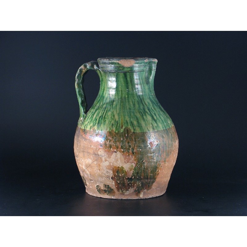 A large medieval pottery jug, the handle with three grooves, the upper section with a mottled green glaze. Chips and wear. Probably 14th century, 31cm.
