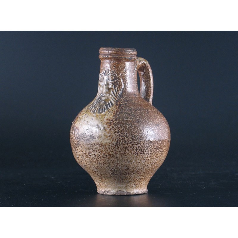 A small brown saltglaze stoneware Greybeard jug, with a simple loop handle, 17th/18th century, 14cm.