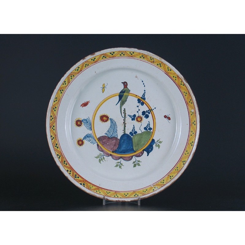 A Delft dish, painted in polychrome with a parrot on a yellow rim, with stylized rockwork, flowers, foliage and bugs. Small chips to the border. 18th century, 33cm.