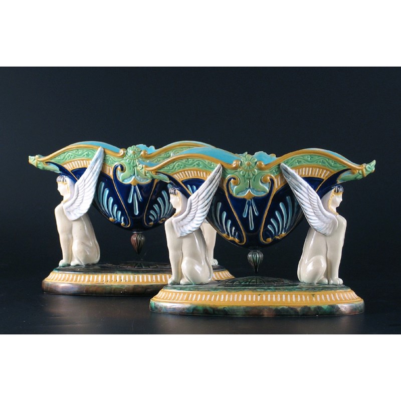 A pair of George Jones Majolica 'sphinx' jardini the bowls supported by winged sphinxes and raised on oval bases, one with a pattern No.2744. One with a small chip. c.1870-80, 22cm. (2)