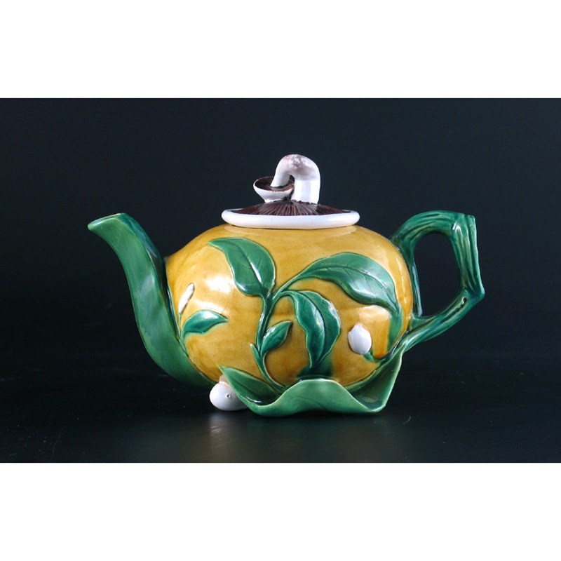 A good Minton Majolica teapot and cover, modelled as a lemon issuing flowers and leaves, the cover formed as a mushroom, a faintly impressed mark, c.1860, 18cm. Long. (2)