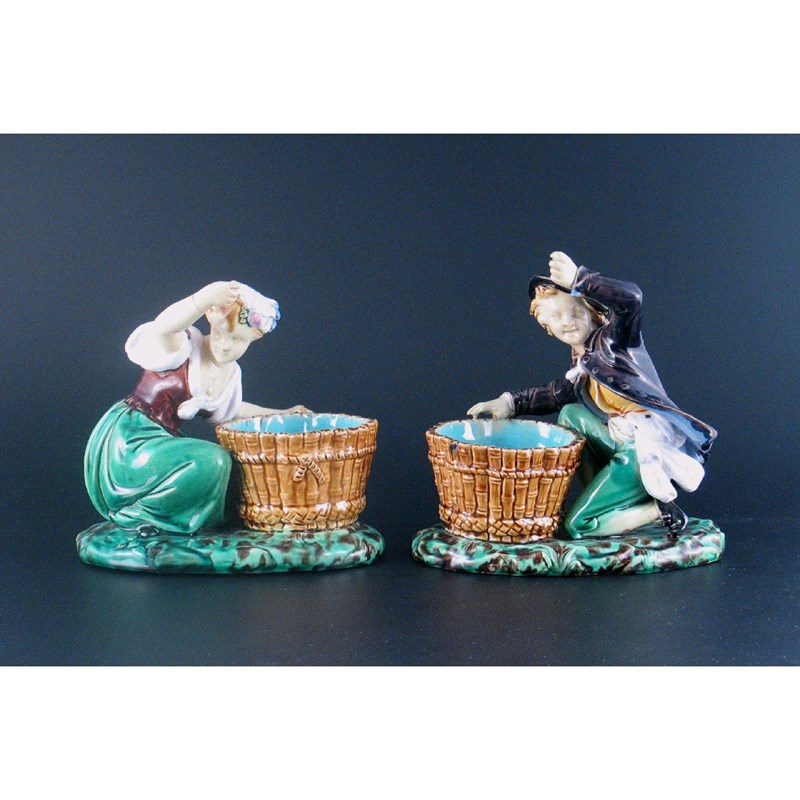 A pair of Minton Majolica sweetmeat figures, modelled as a young boy and girl kneeling beside a basket and raised on mottled bases, impressed marks and date codes for 1870. Both with damage. 19.5cm. (2)