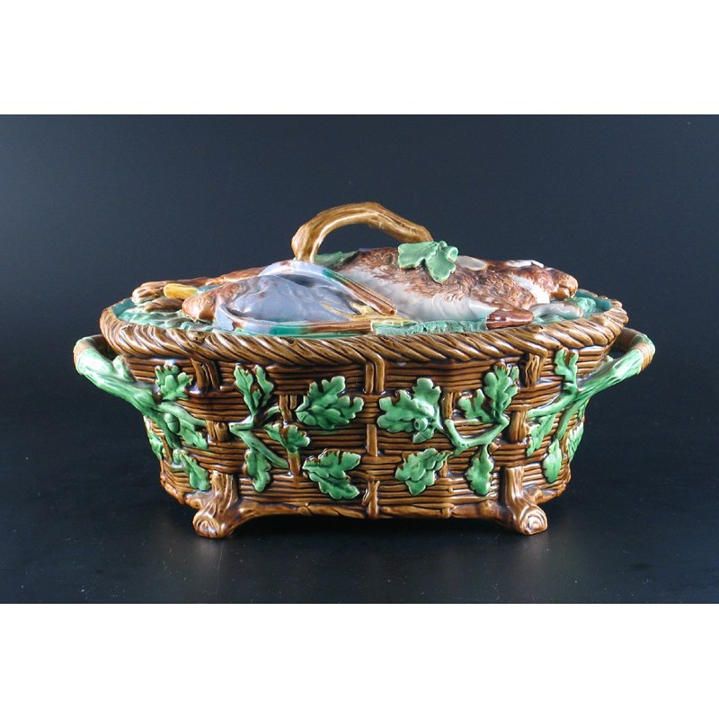 A Minton Majolica game pie dish and cover, moulded with a hare, a mallard and a crow, impressed marks. A few tiny flakes around the rim of the cover. c.1863, 33cm. (2)