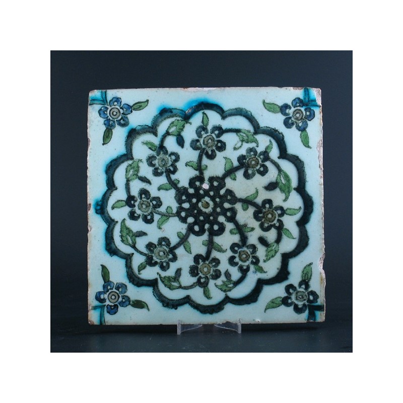 A Middle Eastern polychrome pottery tile, decorated with stylized spiralling flowers, probably 17th century, 26cm.