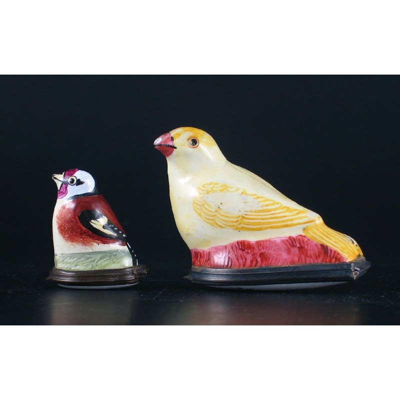 Two enamels boxes and covers, formed as birds, one a canary the other a goldfinch, the hinged lids painted with flowers, the smaller lid mirrored to the inside. Some wear and damage. 7cm. Max.