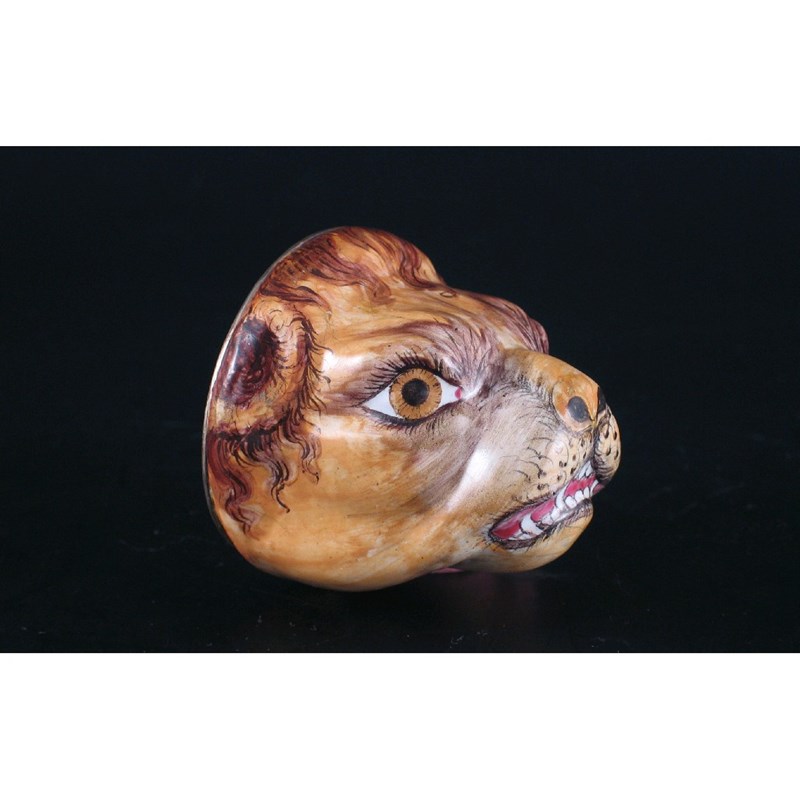An enamel bonbonni formed as a lion's head, bearing its teeth. The cover lacking. Mid 18th century, 5.5cm.