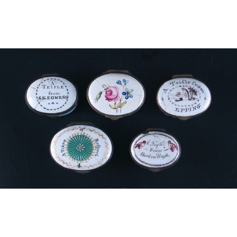 Five oval enamel boxes, inscribed 'A trifle from Skegness', 'A trifle from Epping', 'A trifle from Harlow Bush' and 'A token of respect'. Damages. All 18th century