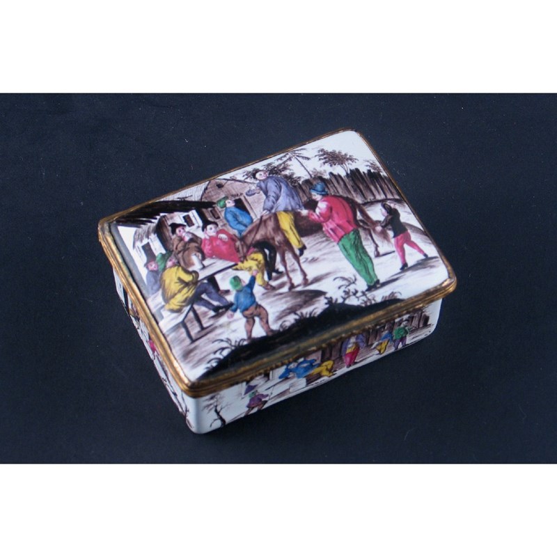 A Continental enamel rectangular box and cover, painted with figures outside a tavern, inside the lid a man courts a woman, 18th century, 8.5cm.