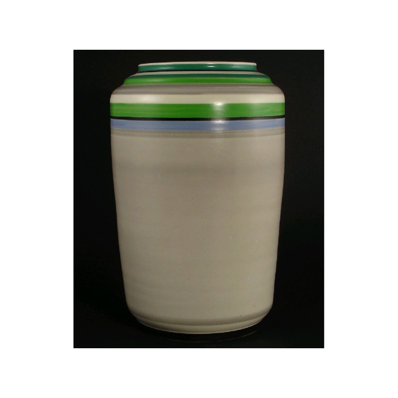 A Poole Pottery Everest vase, shape 660, cylinder form with stepped rim, the rim spray glazed with bands of grey, green and blue on a pale grey ground impressed mark, hairline to top rim. 31cm. high