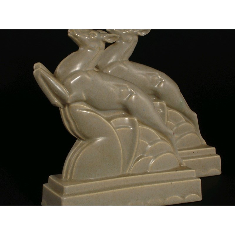 A pair of Carter, Stabler & Adams, Poole 'Springbok' book ends model no.831 designed by John Adams, spray glazed in mushroom impressed marks, damages to ears 21cm. high