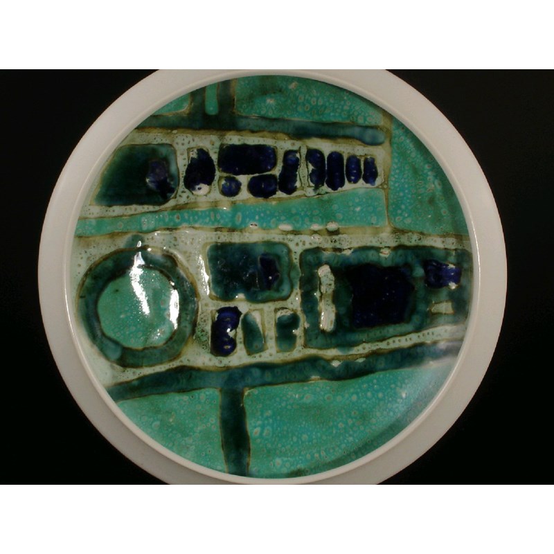 A Poole Pottery Studio plaque by Tony Morris, circular with inverted rim, painted with a geometric abstract design in shades of blue impressed Poole Studio mark, painted TM monogram 27.5cm. diam.