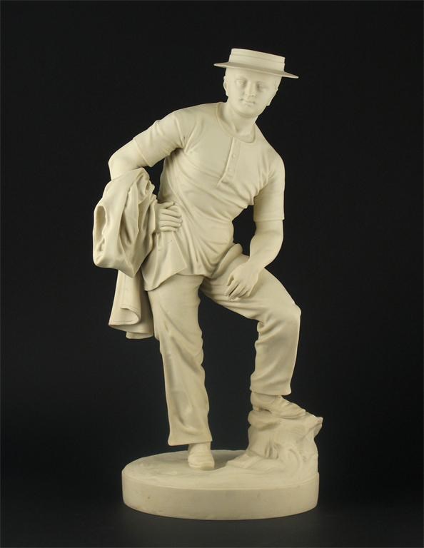 An unusual Copeland Parian model of a young man, after the model by Morris, wearing a boater, standing with his foot on a rock, impressed marks and date codes for 1877, 46cm.