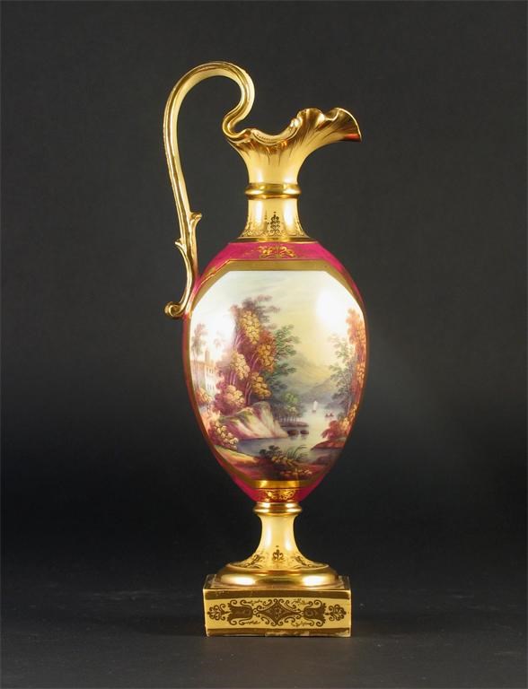 A Minton bone china Pembroke vase, the body painted with a view of a lake with small boats and figures before a building on a gilded claret ground, c.1825-30, 23.5cm.