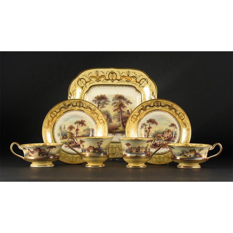 A good Minton bone china part tea service, painted with landscapes within gilded pale yellow borders, pattern no.763, c.1825, comprising: two square plates, and nine trios. (29)